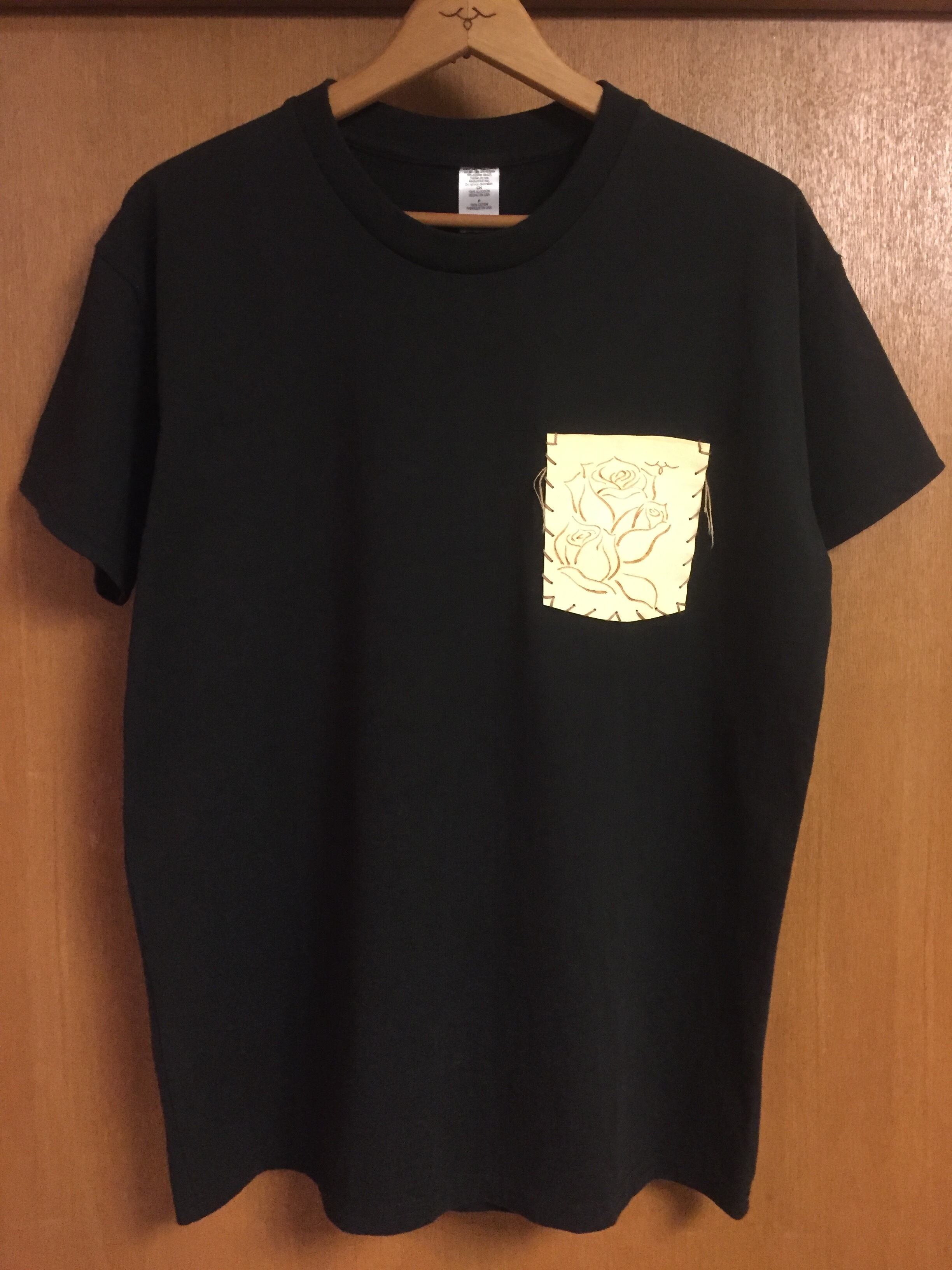 Medicine定番ヘビーウエイト米綿 Tシャツにナチュラル馬革ポケットを麻ひもで手縫いステッチ止めしてバラをモチーフにthe Roseの名曲に因みつつ家族をファミリーを焼印手書き表現した新品リメイク Tシャツ。図柄は個体差が有ります。